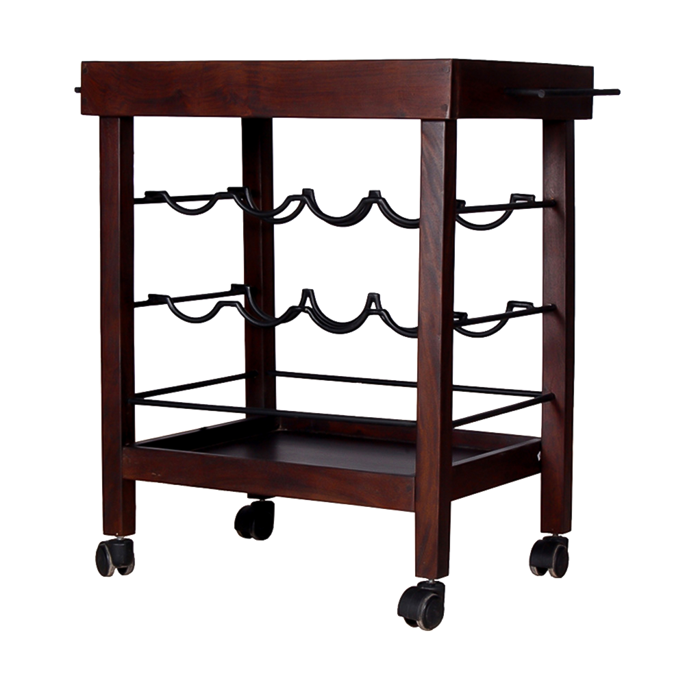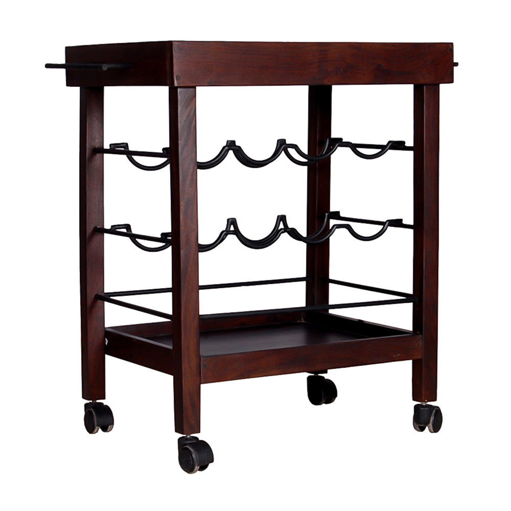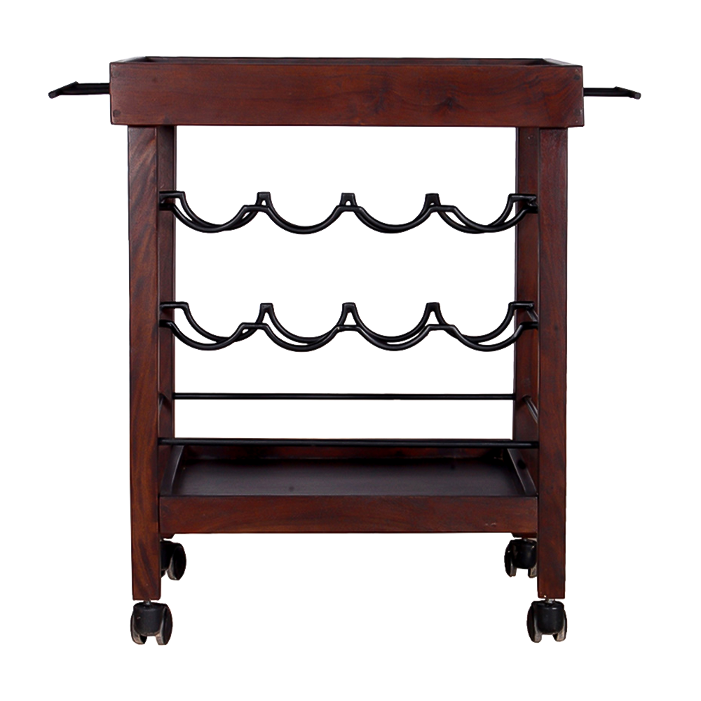 Introducing our versatile and stylish wooden wine cart, perfect for hosting gatherings or adding a touch of sophistication to your home decor. This elegant cart features a robust, dark wood construction, lending a classic feel to any setting. It boasts three tiers, including two with wave-like wooden holders that can securely store up to six wine bottles. The bottom shelf provides ample space for wine glasses or other bar essentials. With its smooth-rolling casters for easy mobility, this wine cart is not just a statement piece but also highly functional. Whether it’s for serving or display, it’s sure to impress.