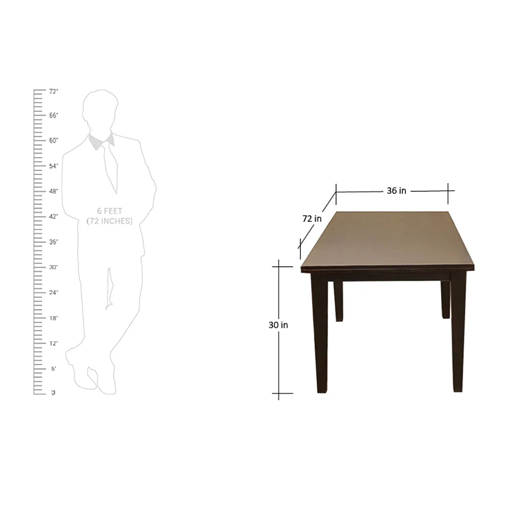 Elevate your dining experience with our classic dining set. Featuring a solid table measuring 72x36 inches and standing 30 inches tall, paired with six comfortable chairs, each 35 inches in height with a 17-inch square seat. Crafted with durability in mind, this set promises enduring style and function for your home. Its sleek design and rich, dark finish will complement any decor, making it a timeless addition to your dining space.