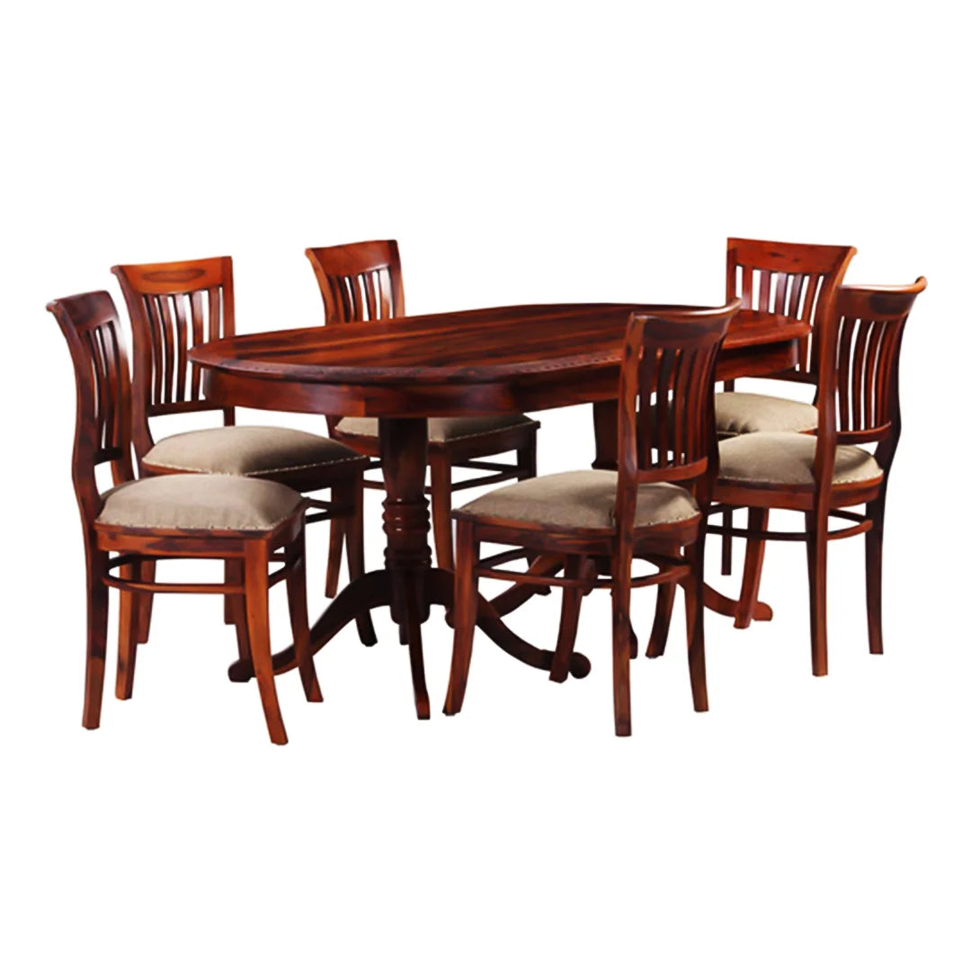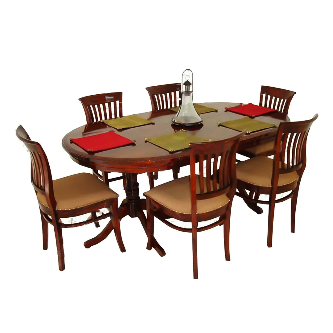 This dining set combo offers a perfect balance of functionality and style. It includes a spacious rounded-edge table with a light wood finish, paired with six wooden chairs featuring a comfortable tan leather cushioned seats.